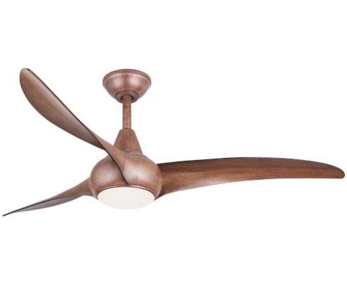 The Light Wave model from Minka-Aire is a standout in both style and performance. Its distressed koa finish gives it a modern, organic look. It includes a remote control and integrated dimmable LED light, and it’s designed for quiet operation.