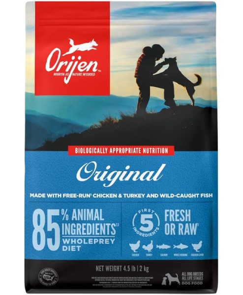 Orijen is known for its biologically appropriate recipes that closely mirror a dog’s natural diet. With up to 85% animal ingredients and fresh regional meats, this food is packed with high-quality protein and nutrients.