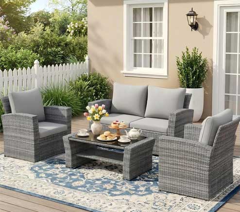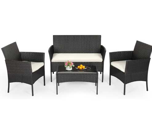 The FDW 4-piece set is a simple but stylish outdoor conversation set consisting of two chairs, a loveseat, and a coffee table. It’s designed for smaller spaces like balconies or compact patios but still offers comfortable seating for four people.