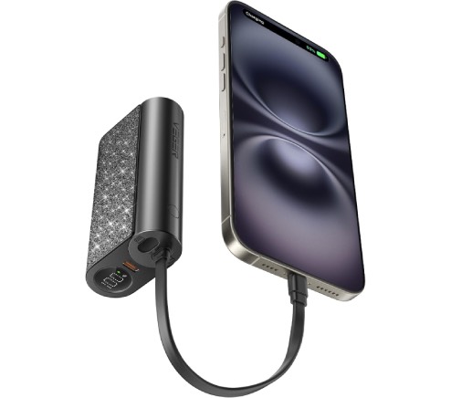 This glittery power bank is a fashion statement with substance. Encased in a shimmering finish, it comes with a built‑in bidirectional USB‑C cable that also doubles as a stylish lanyard—perfect for grabbing on the go.